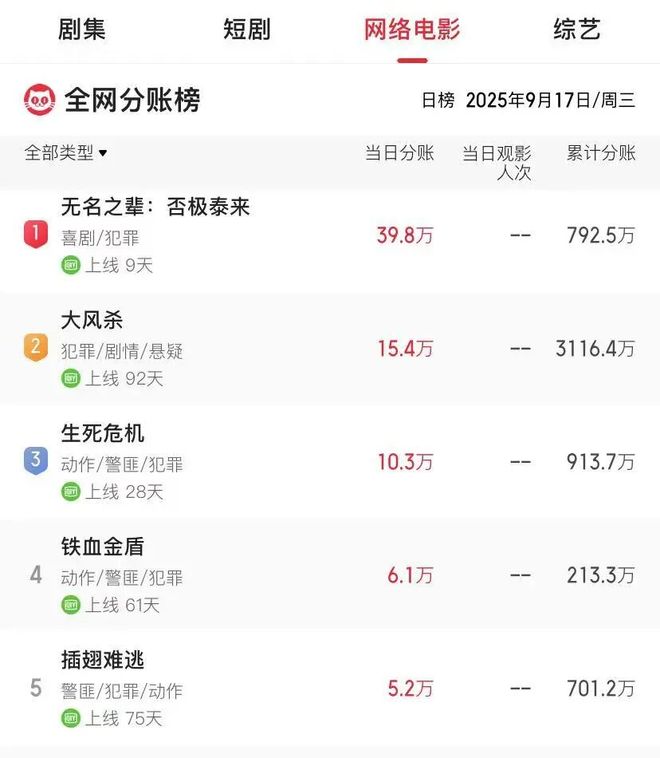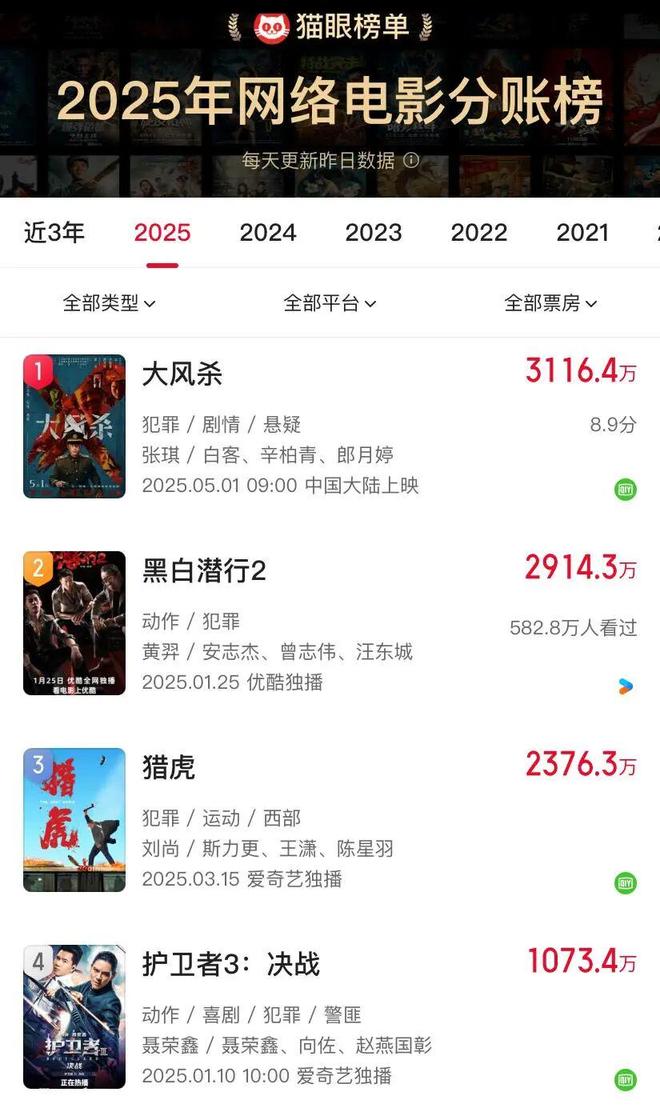 《大风杀》在网端赚了3000万《无名之辈2》并不是第一部受益的院线电影,今年以来,网端分账收益破千万的电影中,位列TOP1的《大风杀》、也是唯一一部分账超3000万的影片,该片就是一部院线电影。