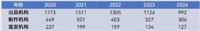 国家广播电视总局监管中心的数据显示,2020年到2024年,网络电影的出品、制作、宣发机构呈逐年下降的趋势,其中,出品和制作机构数量几乎“腰斩”。受此影响,网络电影的上新、备案数量都在收缩,据不完全统计,2023年上线部,近两年则更少。