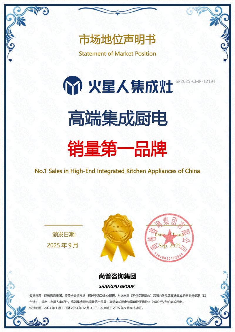 这一系列数据与认证,共同勾勒出火星人在高端集成厨电领域无可撼动的领先者形象。即便在行业格局频繁变动、竞品加速迭代的背景下,火星人依然能凭借硬实力穿越周期,稳居领先阵营。